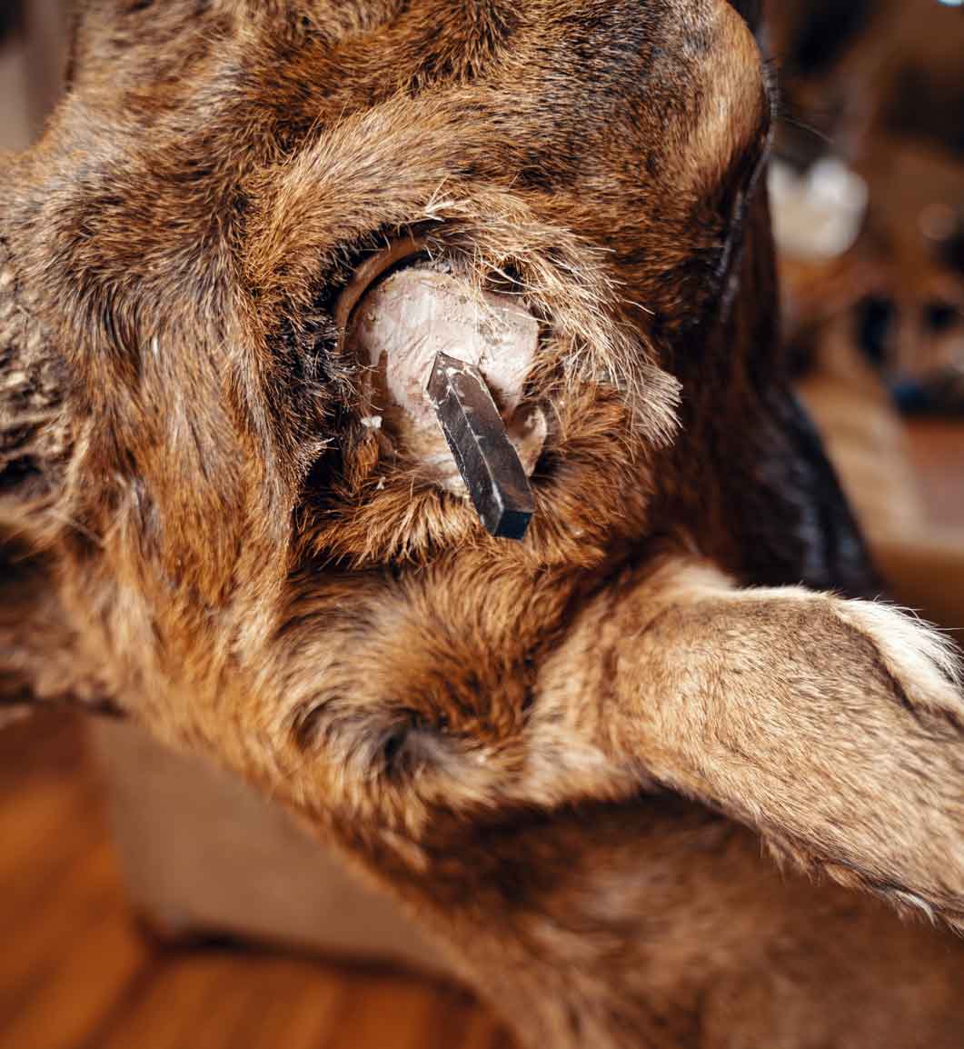The physical process of Dip and Pack entails the removal of all flesh and tissue from skulls, horns and bones, and the drying and bleaching of said skulls and bones.